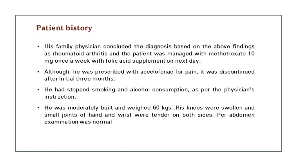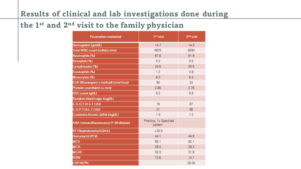 The 43-year-old male patient had 1 and half year history of polyarthritis, involving both small and large joints. The initial presentation involved only hands and later progressed to elbows, knees, and feet. No antecedent fever, skin rashes, oral ulcers or backache was observed. Based on these symptoms, the patient was diagnosed as RA by the family physician and treated with MTX. The patient had significant improvement in pain and symptoms. Â Soon after the completion of the treatment course, the patient developed fever, weight loss, and worsening of joint symptoms. His previous investigation revealed abnormal LFT and the current investigations suggested worsening of liver enzymes. The inflammatory parameters like CRP and ESR were elevated. Increase in ESR was noted when compared to the previous evaluation, but the CRP remained same. Patient's RF was negative and ANA was positive in both the evaluations.