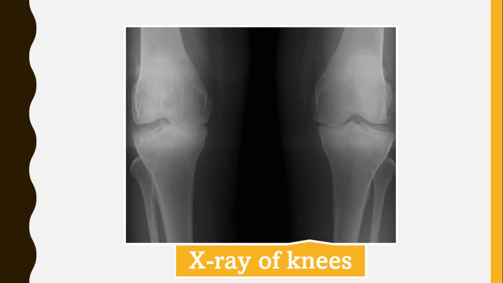 She had no significant wrist stiffness and limitation of movements of knees. Inflammatory parameters were normal and radiography of both hands and knees showed grade 3 osteoarthritis changes. Â The other diagnoses to be considered are rheumatoid arthritis and seronegative spondyloarthropathy.