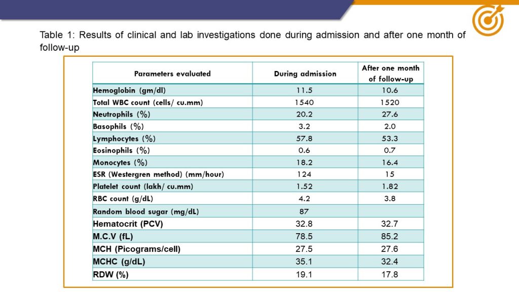 The 61-year-old, female patient had long-standing RA of 6 years duration and was on alternative therapy for the past 5 years and intermittent NSAIDs. She had severe dry mouth/eyes, significant weight loss, reduced appetite, and back pain. She had persistent dry cough, but chest X-ray was normal.  The patient was immobile with minimal swelling and pain. History wise patient can be considered to have Rheumatoid arthritis, Systemic lupus erythematosus, Sjogren’s syndrome, malignancy associated rheumatic disease. But to considered the malignancy associated rheumatic disease duration of 6 months is too long. The weight loss though may be an indicator towards it, but duration is too long to consider the diagnosis.  Her investigation revealed normal Hb%, significant leukopenia with absolute granulocyte count (AGC) less than 600 cell/ cu mm. Her platelet count and the levels of alkaline phosphatase, liver enzymes, vitamin B12 and folic acid were normal. She had significantly elevated ESR and CRP levels. Serum albumin and vit D3 were below normal. Her ANA was negative.