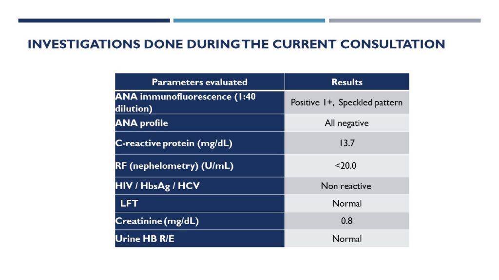 She was managed on small doses of steroids and azathioprine. The rashes reduced and symptomatically improved. The patient is on regular follow-up and there is no further organ involvement.