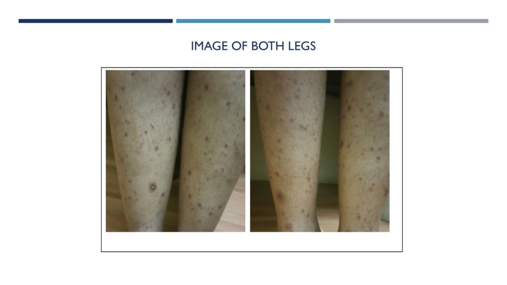 The 28-yr-old female had a 15-day history of gradual onset of erythematous petechial rashes, predominantly in lower limb and abdomen. History revealed that the rashes appeared in crops and faded in 3-4 days, however some were ulcerative and non-itchy. Clinical investigation revealed that the patient was positive for ANA, ANCA positive and anti-PR3. The lesions were raised, petechial, purpuric and ecchymosis. The complement levels were normal. CRP and ESR were elevated.