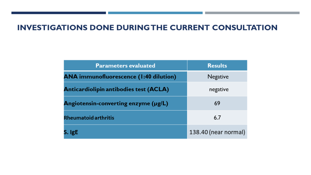 Another probable diagnosis is sarcoidosis. But the absence of mediastinal lymph nodes and typical clinical and ophthalmic features suggests that sarcoidosis is less likely. However, serum ACE level assessment excluded the possibility in the current case.