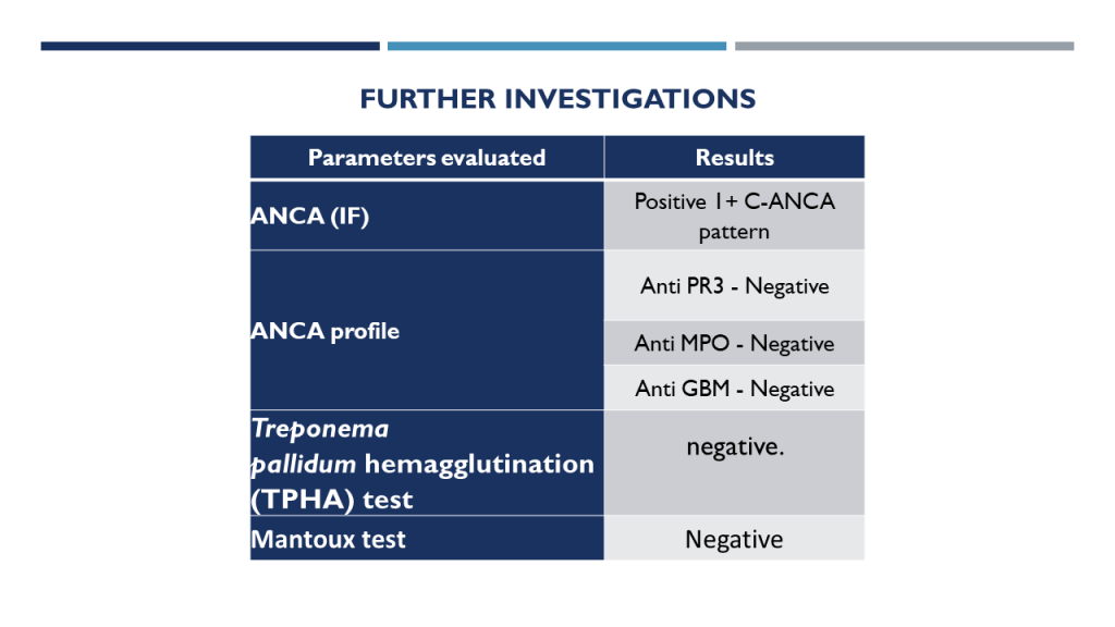 Overlap of SpA with vasculitis could be suspected, but the chance is rare when considering the normal pelvis X-ray and the age/gender of the patient. The patient does not fulfill ESSG criteria for diagnosing SpA. Among the infections, syphilis can have similar manifestations, whereas the disease is rare in the current decades and was excluded by the treponema pallidum hemagglutination (TPHA) test. The other possibility to be considered is TB and it cannot be ruled out in patients with extrapulmonary or classical lesions of Wegener's granulomatosis (WG) or vasculitis. In a Mexican study, 44.4% of the 45 TB patients were positive for ANCA by indirect immunofluorescence (IF) and 40% of patients by ELISA, which was higher than the control groups. Thus, in a country with a high prevalence of TB, the direct interpretation of an ANCA‐positive result as indicative of primary systemic vasculitides, especially WG, is not advocated.3 This is more important in patients with no classical features of the disease. The combined reactivity of IF and anti-PR3 would seem to be more suggestive of WG and is recommended in a clinical setting to distinguish between ANCA-associated vasculitis (Wegener's granulomatosis) and TB mimicry.4 Tb quantiferon and/or Mantoux should be performed to exclude the possibility of tuberculosis. The challenges are the difficulty to interpret these tests in an endemic area of TB and the necessity to perform anti-PR3 and anti-MPO by ELISA/blot method to confirm the diagnosis.