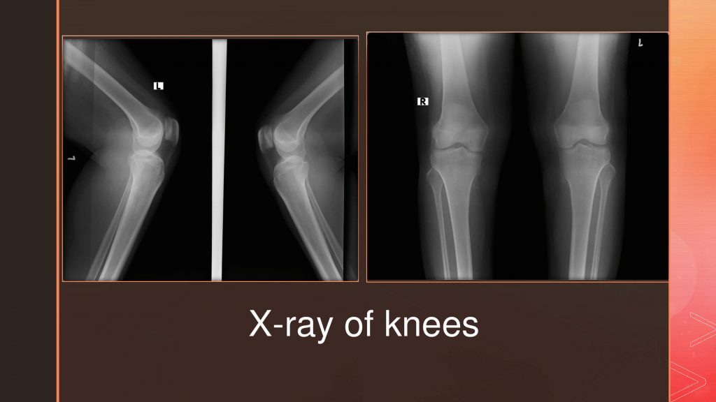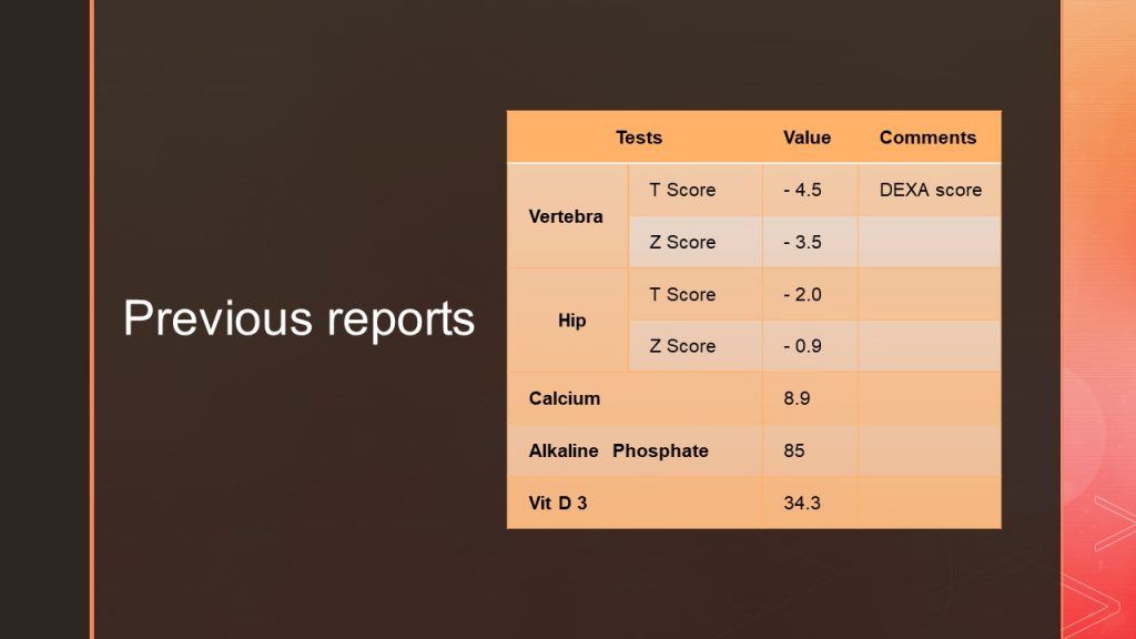 55 years, female presented with back pain of inflammatory nature. She had both knee pain from the age of 40, with episodes of swelling, and inflammatory parameters being significantly elevated. The BMD indicated a significantly low score and no pathological fracture to date, The serum vitamin D levels were also normal. Radiological images of knee joints show normal knee joints, pelvis shows bilateral normal sacroiliac joints.