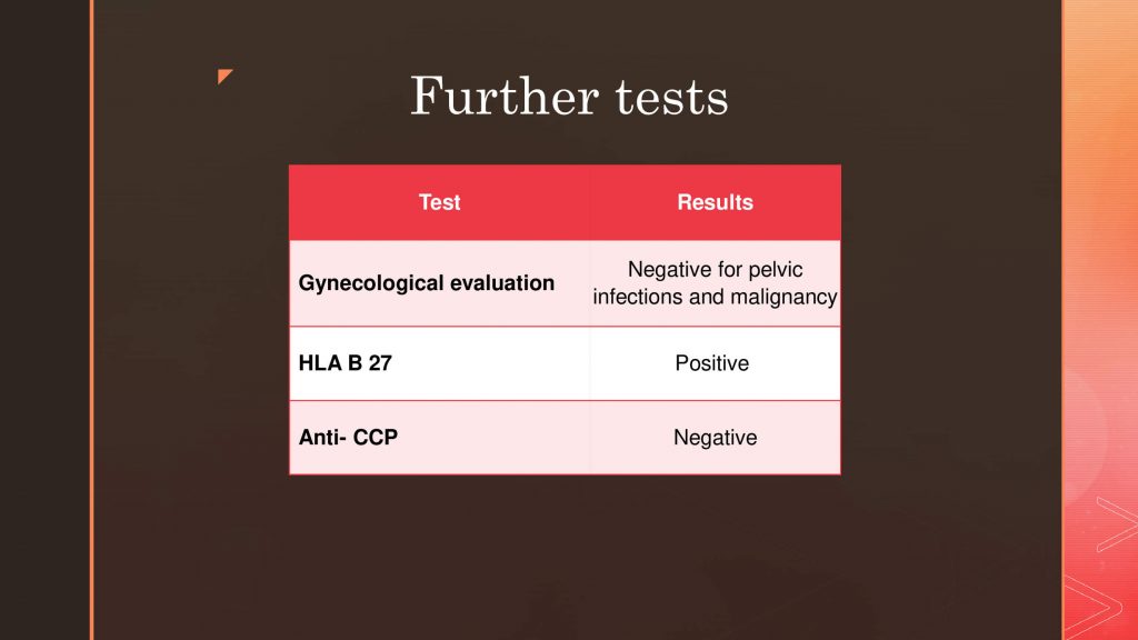 The present case fulfills the ASAS classification criteria2 (figure 1 & 2) required for axial spondyloarthritis other than age and radiographic features. However, the possibility of spondyloarthropathy is relatively low for these female patients aged above 55 years. Radiographs of the knee and pelvis, and even that of the spine, do not suggest significant degenerative changes. Under the circumstances, one must consider the possibility of Infection including pelvic infection as well the malignancy like Multiple myeloma, as the inflammatory parameters are elevated. Evaluation of electrophoresis suggested an inflammatory pattern. Gynecological evaluation for pelvic infections and malignancy was found to be negative. The patient was HLA B 27 positive and anti-CCP negative.